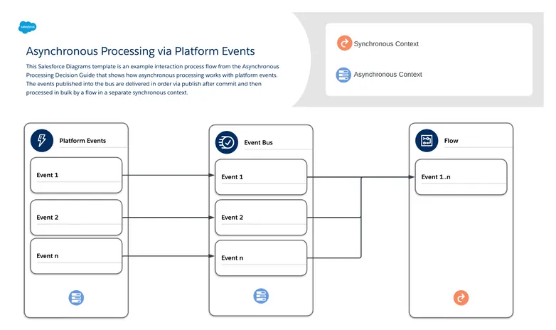 shows how asynchronous processing works with platform events. The events published into the bus are delivered in order via publish after commit and then processed in bulk by a flow in a separate synchronous context.