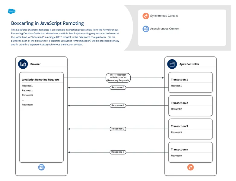 shows how multiple JavaScript remoting requests can be issued at the same time, or “boxcar'ed” in a single HTTP request to the Salesforce core platform. On the platform, each of the boxcars (i.e. a separate JavaScript remoting action) will be processed serially and in order in a separate Apex synchronous transaction context.