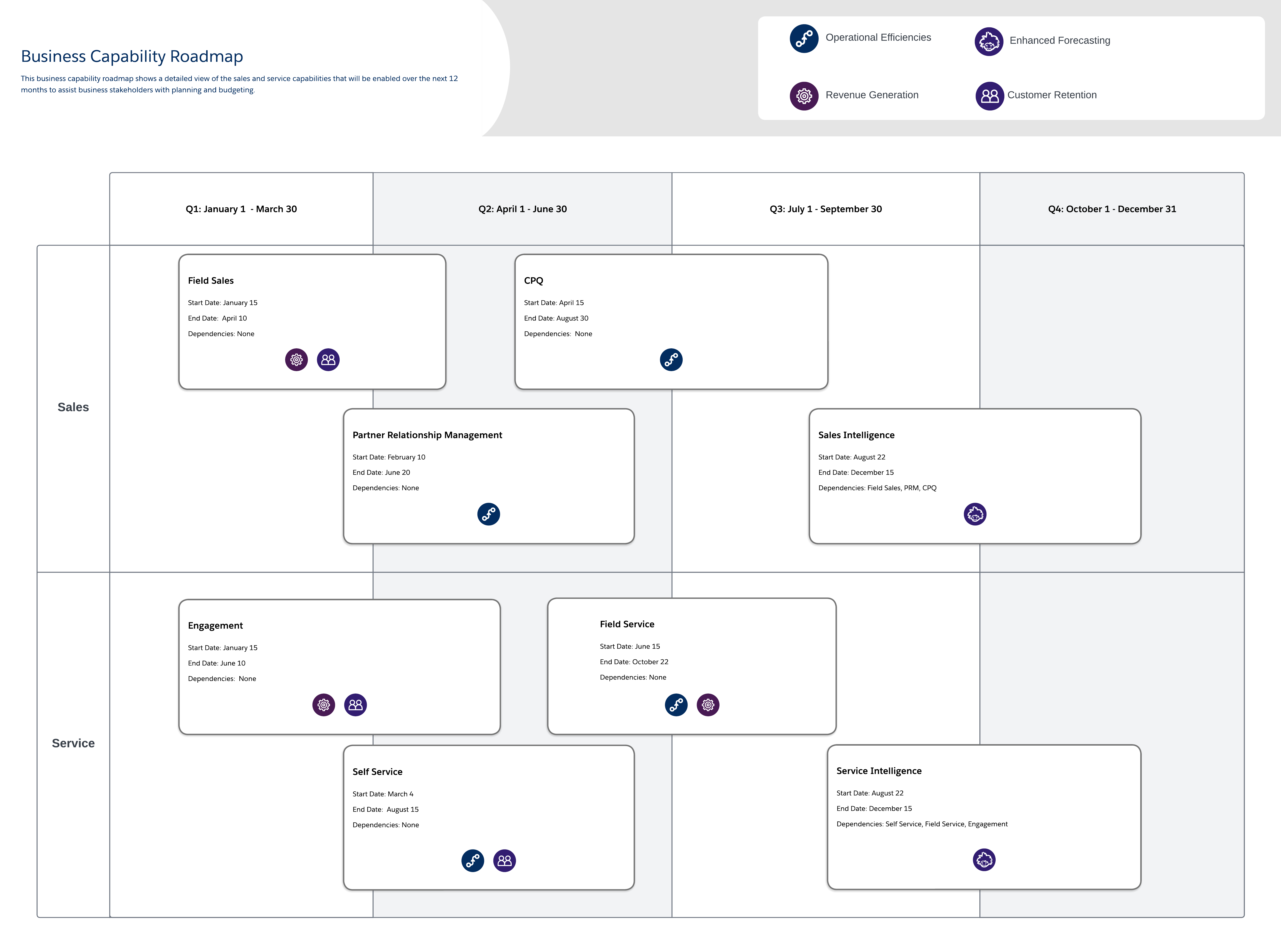 A visual roadmap that streamlines resource planning and budgeting by grouping capabilities and identifying implementation order, dependencies, and value. For each capability in this diagram, it is common to have a dedicated Component Roadmap to drill into the details of the delivery.