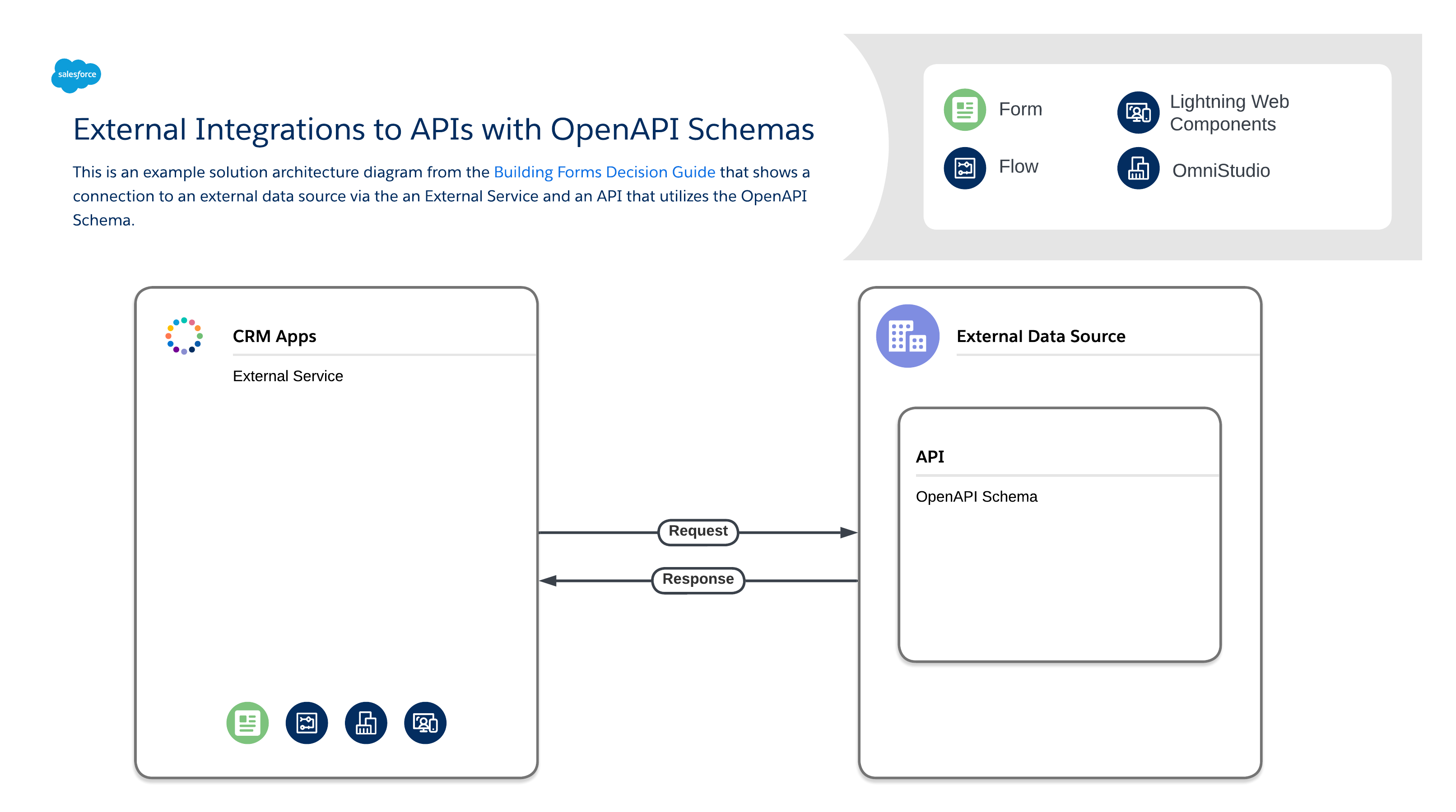 This is an example solution architecture diagram from the Building Forms Decision Guide that shows a connection to an external data source via the an External Service and an API that utilizes the OpenAPI Schema.
