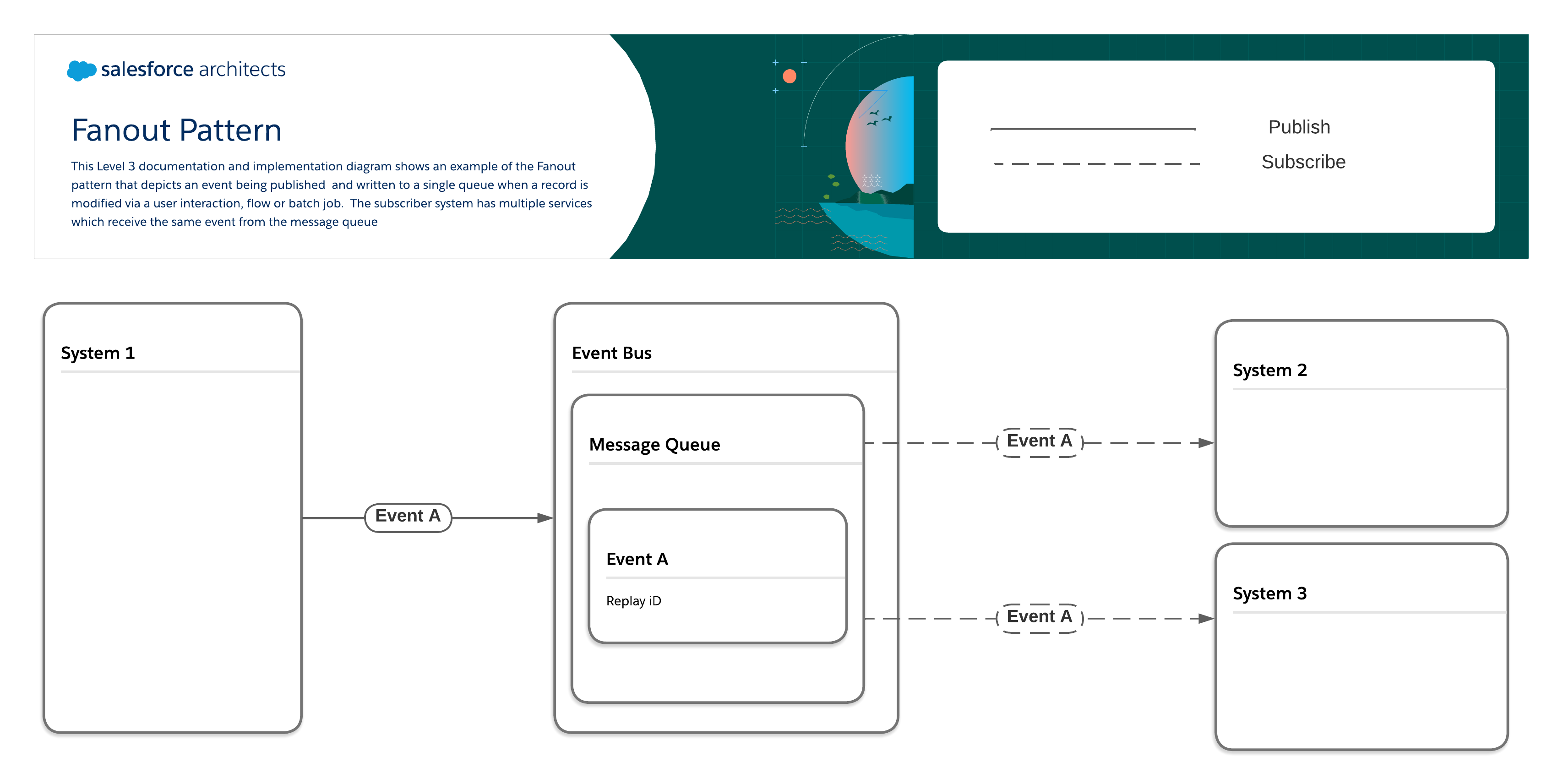 shows an event being published and written to a single queue when a record is modified via a user interaction, flow or batch job. The subscriber system has multiple services which receive the same event from the message queue