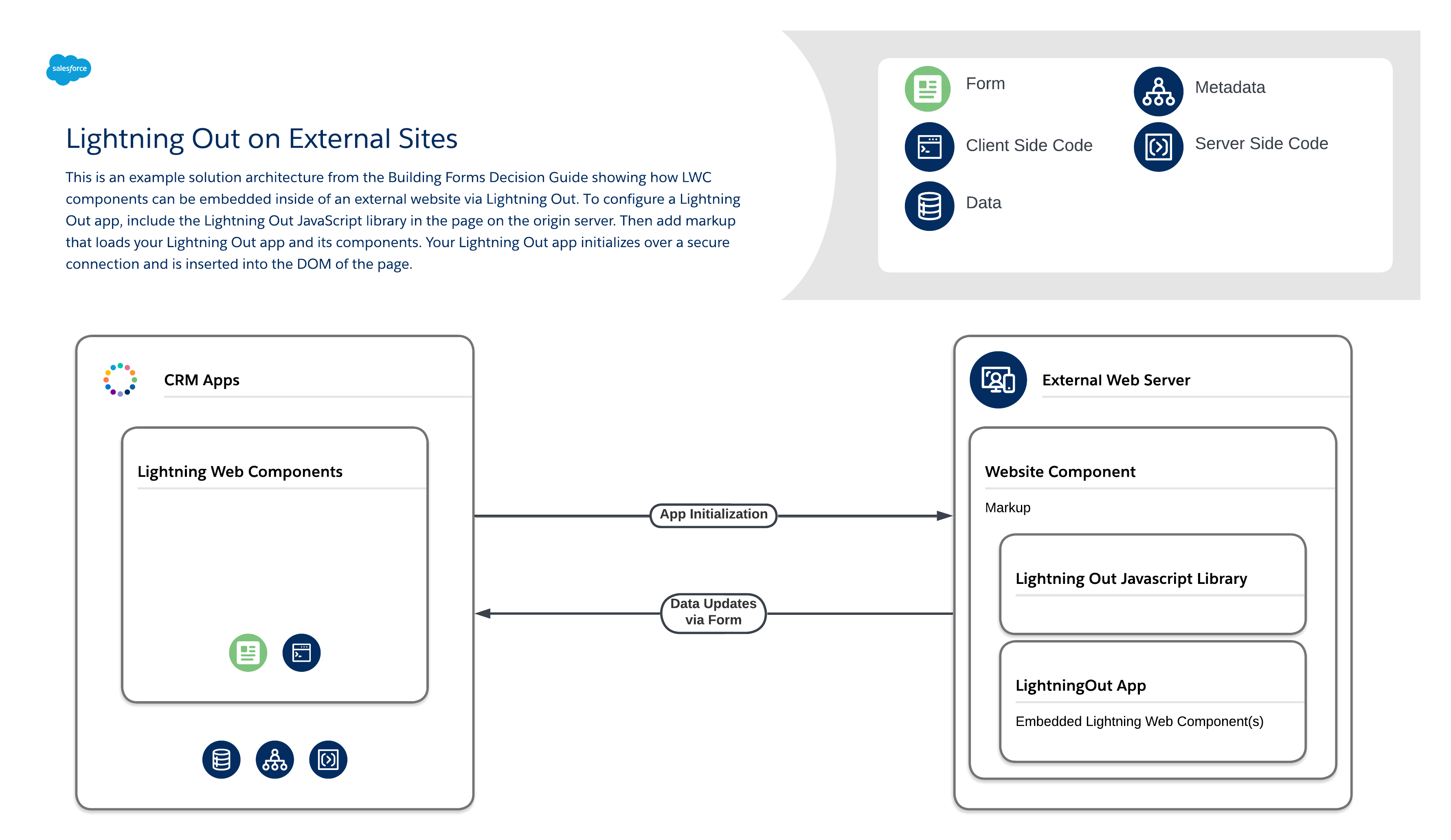 This is an example solution architecture from the Building Forms Decision Guide showing how LWC components can be embedded inside of an external website via Lightning Out. To configure a Lightning Out app, include the Lightning Out JavaScript library in the page on the origin server. Then add markup that loads your Lightning Out app and its components. Your Lightning Out app initializes over a secure connection and is inserted into the DOM of the page.