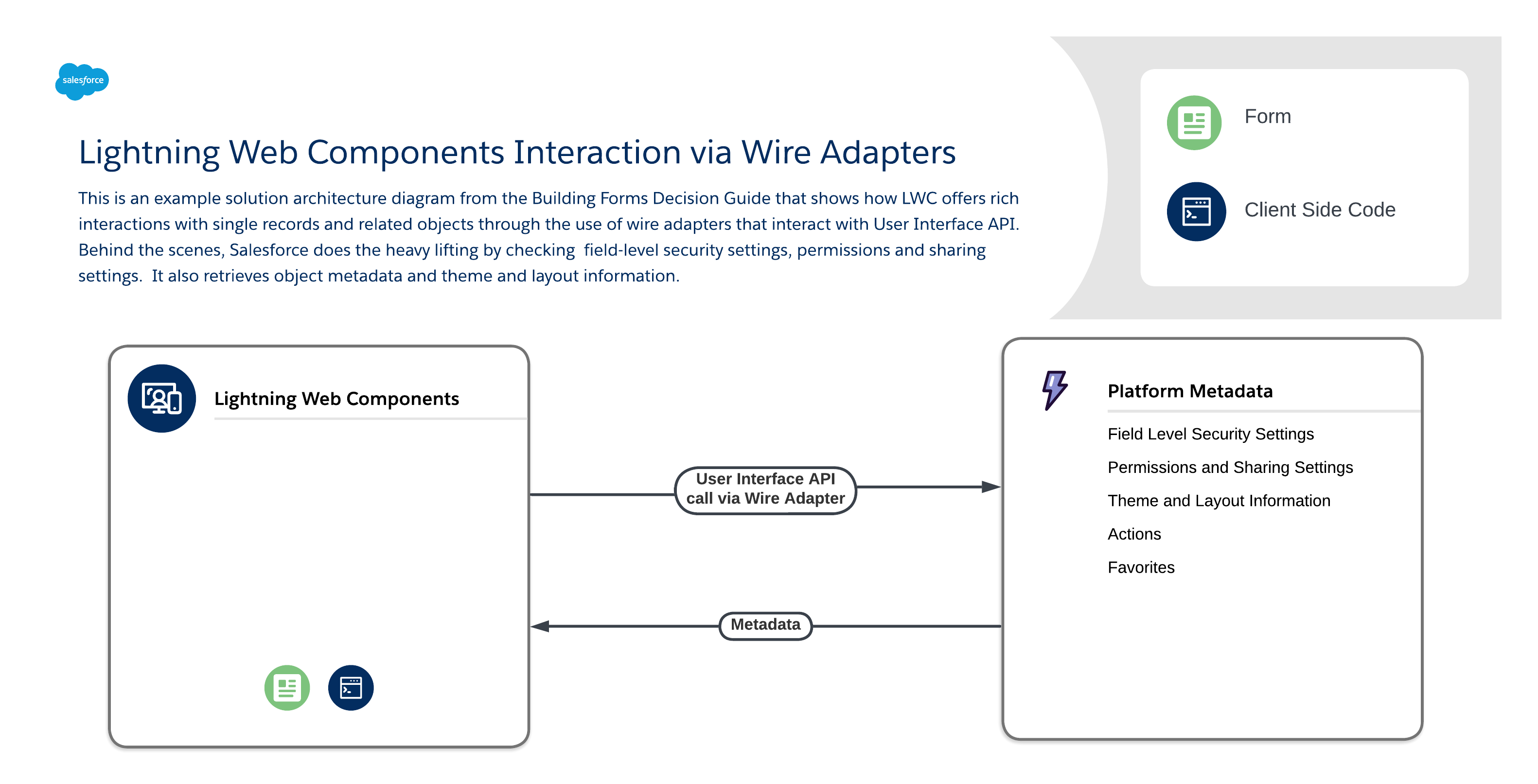 This is an example solution architecture diagram from the Building Forms Decision Guide that shows how LWC offers rich interactions with single records and related objects through the use of wire adapters that interact with User Interface API. Behind the scenes, Salesforce does the heavy lifting by checking field-level security settings, permissions and sharing settings. It also retrieves object metadata and theme and layout information.