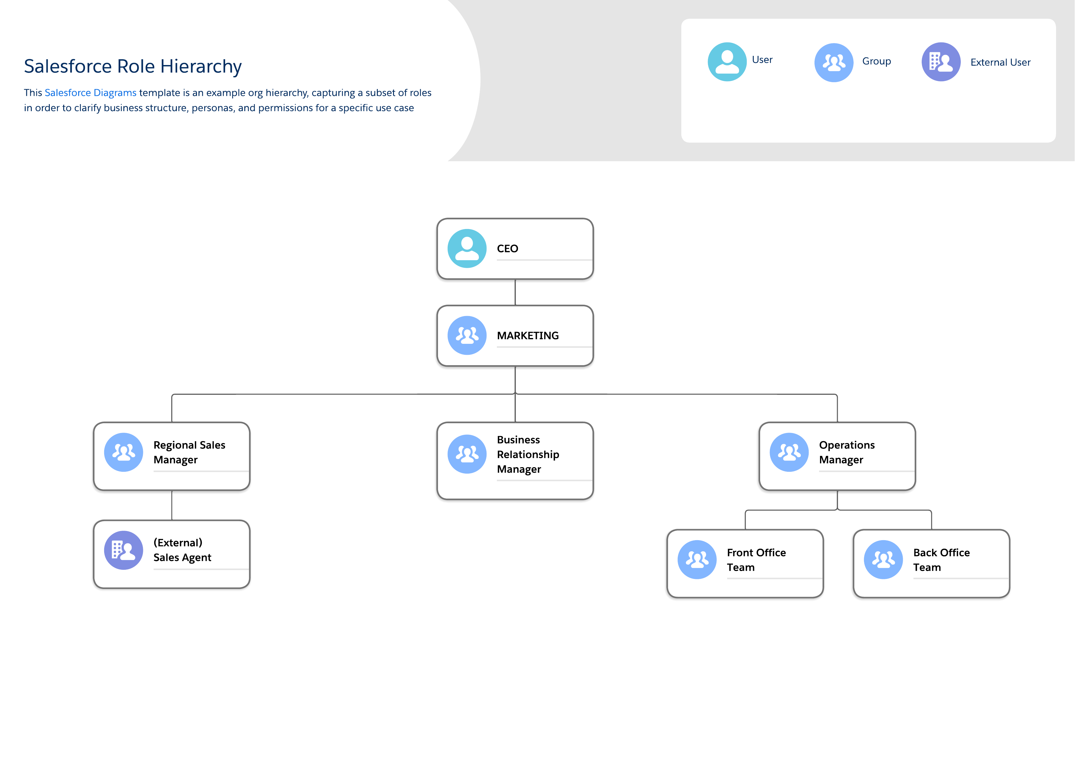 an example org hierarchy, capturing a subset of roles in order to clarify business structure, personas, and permissions for a specific use case
