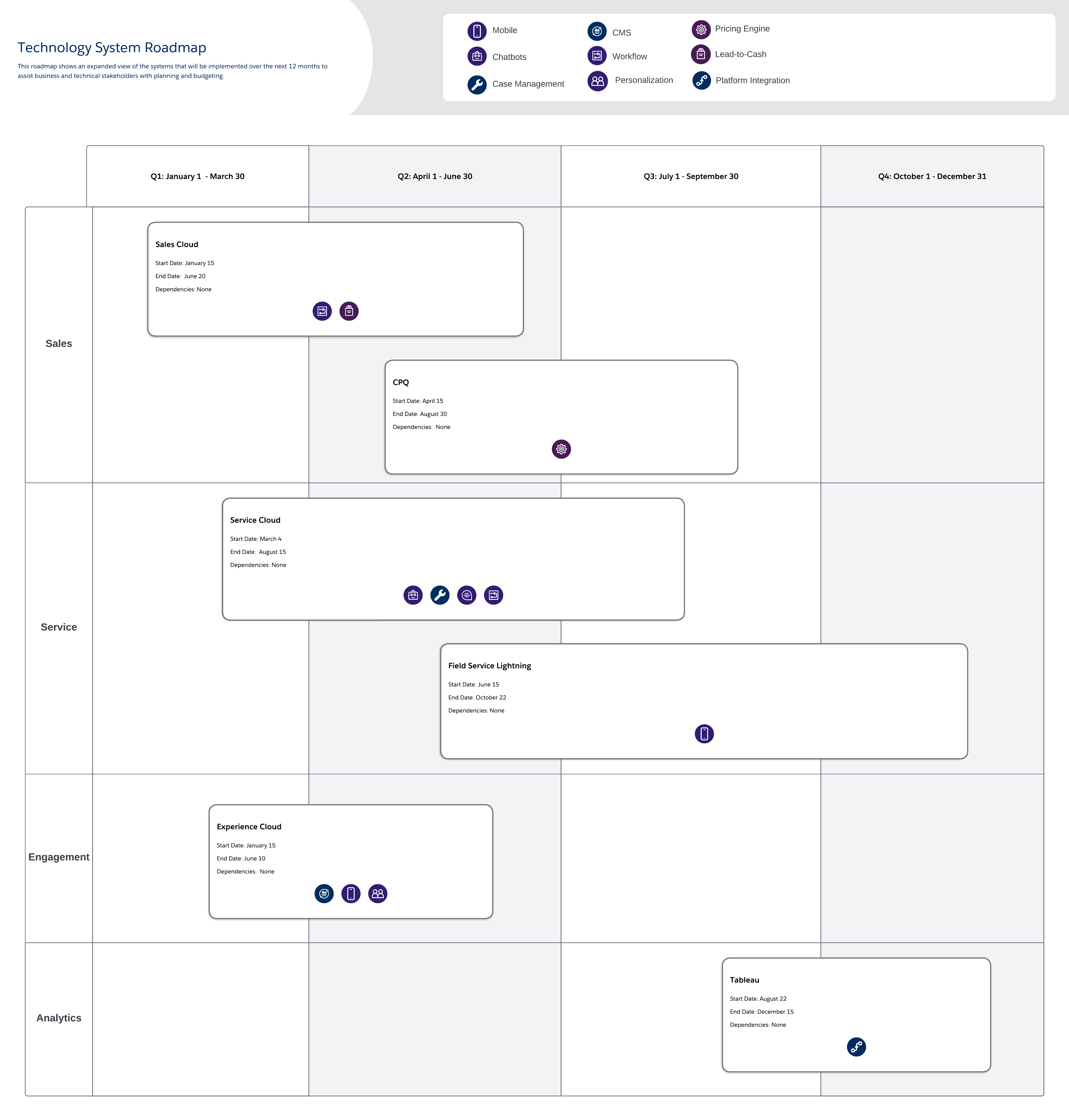 system roadmap - Simplify resource planning and budgeting by identifying system implementation order, dependencies, functional areas, and relevant features for stakeholders.