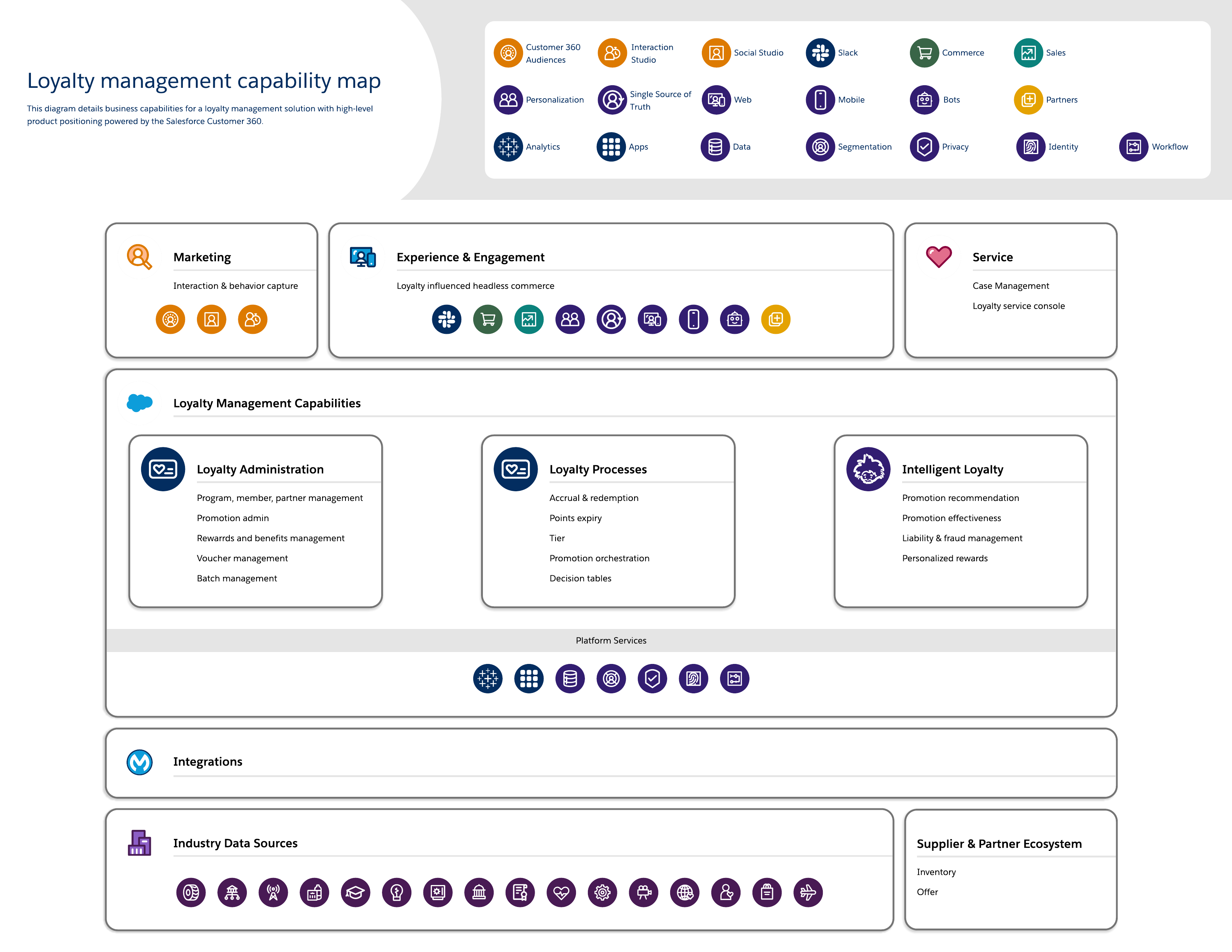 Карта возможностей, отображающая службы управления лояльностью с высокоуровневым позиционированием продукта. Она содержит такие возможности, как администрирование лояльности, обработка и Analytics.
