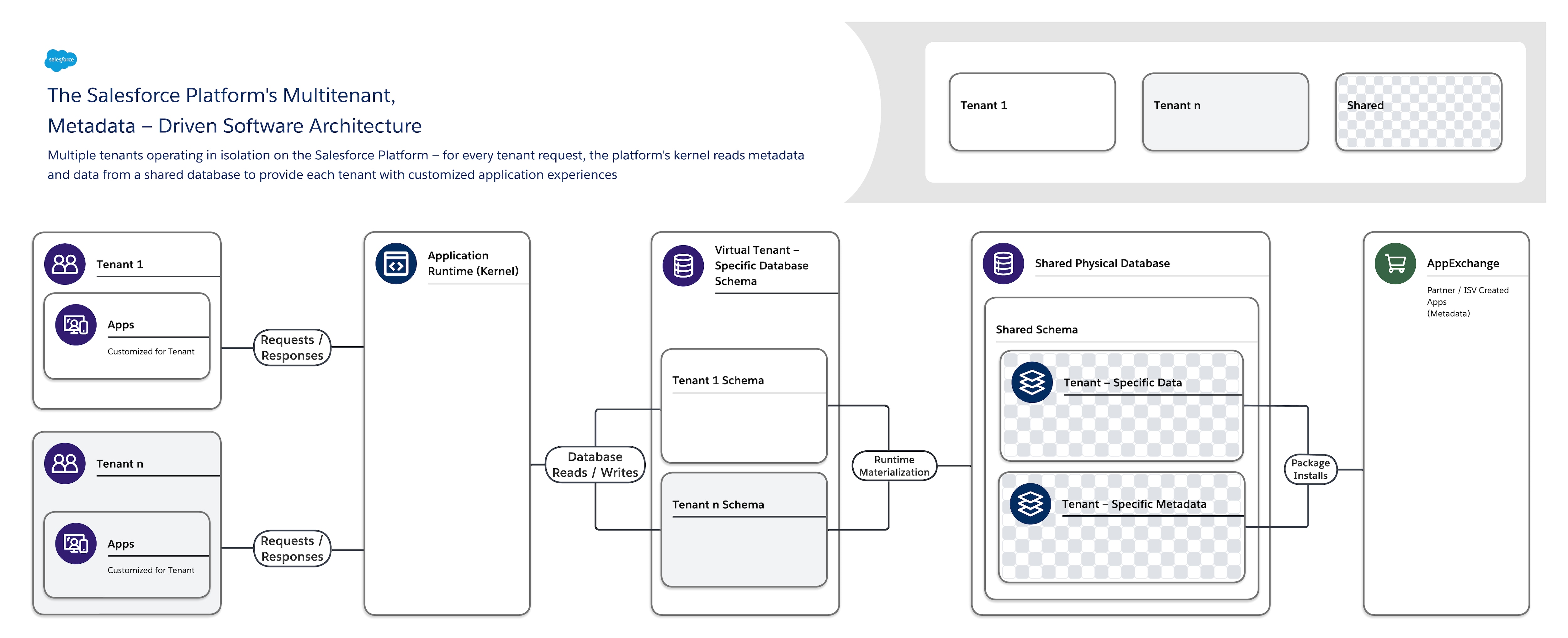 In large part, the Salesforce Platform is so successful and popular because its unique software architecture supports applications that are easy to build, use, customize, and extend with exceptional performance and reliability. The heart of the platform’s software architecture is its multitenant, metadata-driven design.
